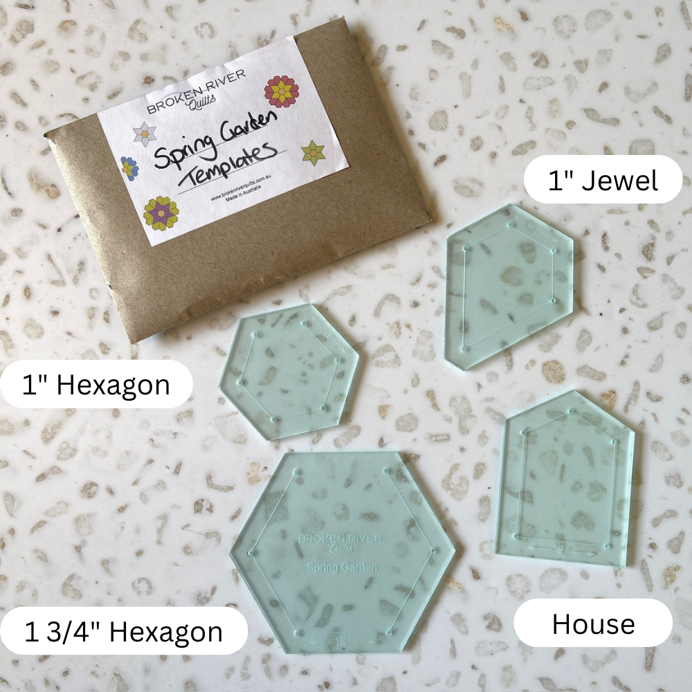 - Four templates: One (1) – 1” Jewel, one (1) – 1” Hexagon, one (1) – 1 3/4” Hexagon and one (1) – House.